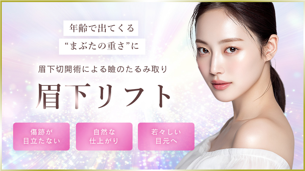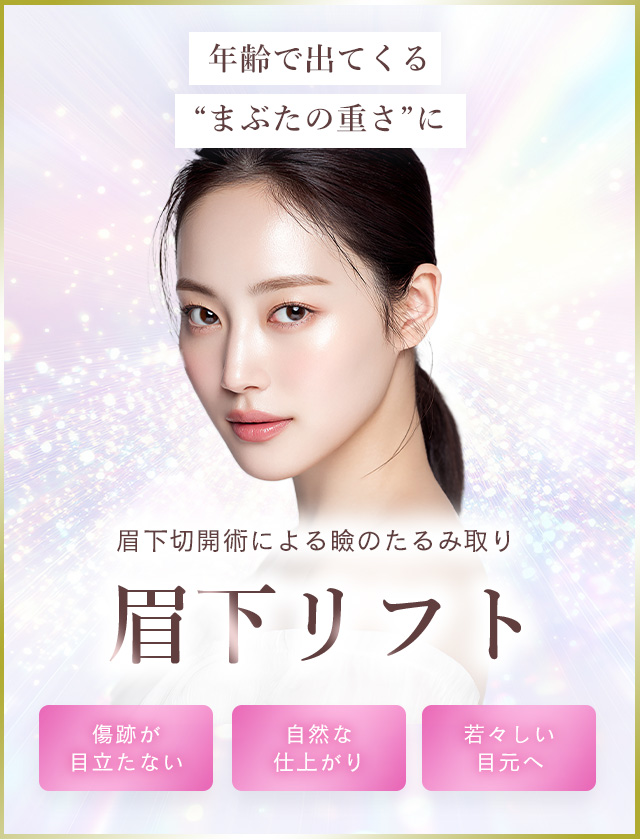 眉毛下のラインに沿って余分な皮膚を取り除きます。 手術後、約1週間で抜糸を行います。しばらくは皮膚が過度に引っ張られたように感じますが、1~2か月かけて自然な形に馴染んでいきます。線状の傷跡は1~2か月は赤みや硬さが生じますが、3か月~半年でわからない程度まで目立たなくなります。眉墨やアートメイクなどをした場合にはまず気付かれることも無いでしょう。